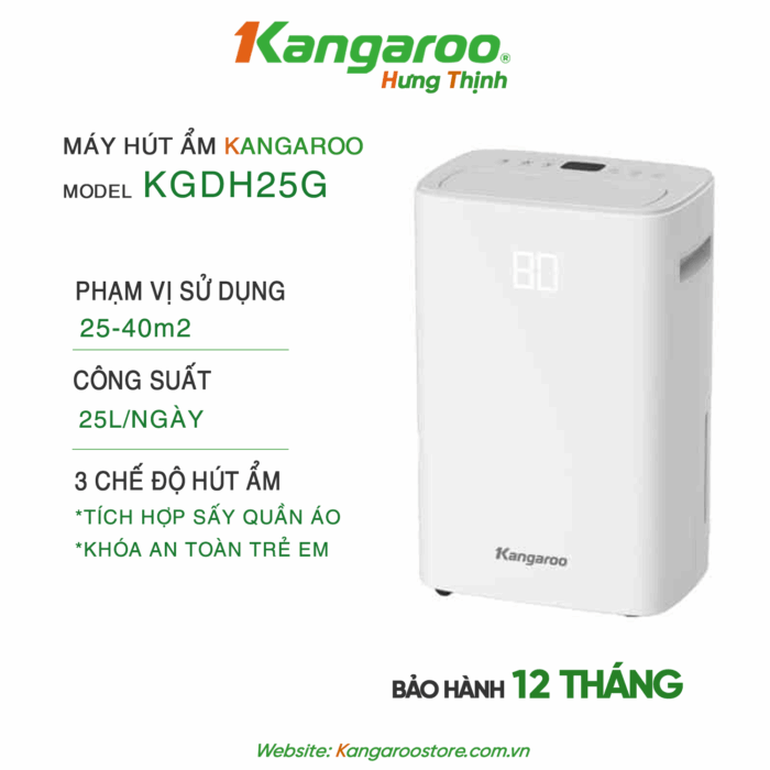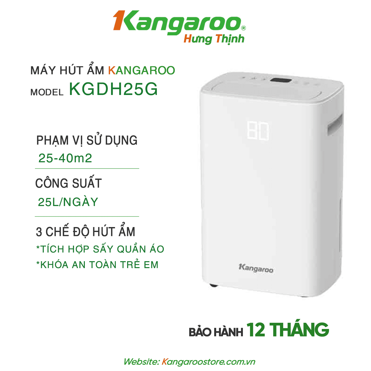 Hoạt động trên nguyên lý ngưng tụ hơi ẩm, KGDH25G của Kangaroo hút toàn bộ hơi ẩm trong không khí, rồi đưa qua hệ thống làm lạnh để ngưng tụ thành nước, sau đó đẩy chúng xuống khay đựng. Sản phẩm giúp sàn nhà không còn ướt, quần áo hong khô, độ ẩm tối ưu, ngăn ngừa nấm mốc phát triển cho không khí trong lành hơn.
