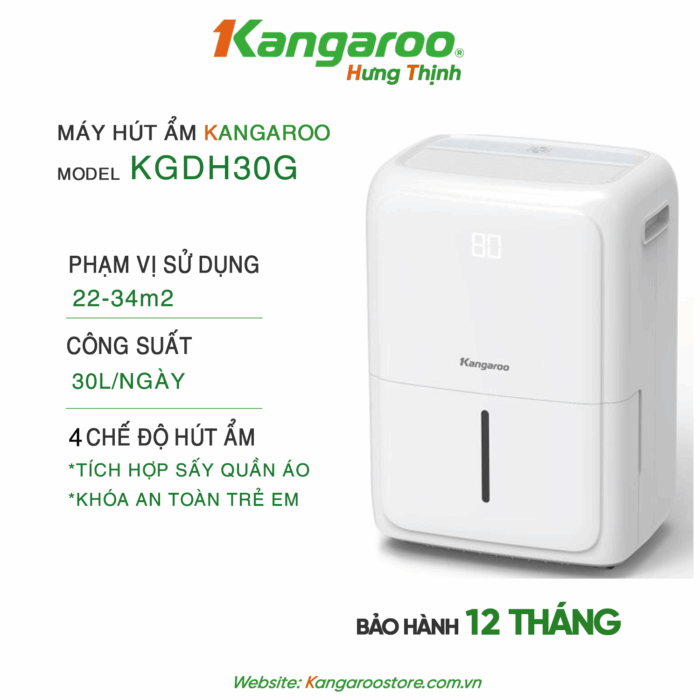 Hoạt động trên nguyên lý ngưng tụ hơi ẩm, KGDH30G của Kangaroo hút toàn bộ hơi ẩm trong không khí, rồi đưa qua hệ thống làm lạnh để ngưng tụ thành nước, sau đó đẩy chúng xuống khay đựng. Sản phẩm giúp sàn nhà không còn ướt, quần áo hong khô, độ ẩm tối ưu, ngăn ngừa nấm mốc phát triển cho không khí trong lành hơn.
