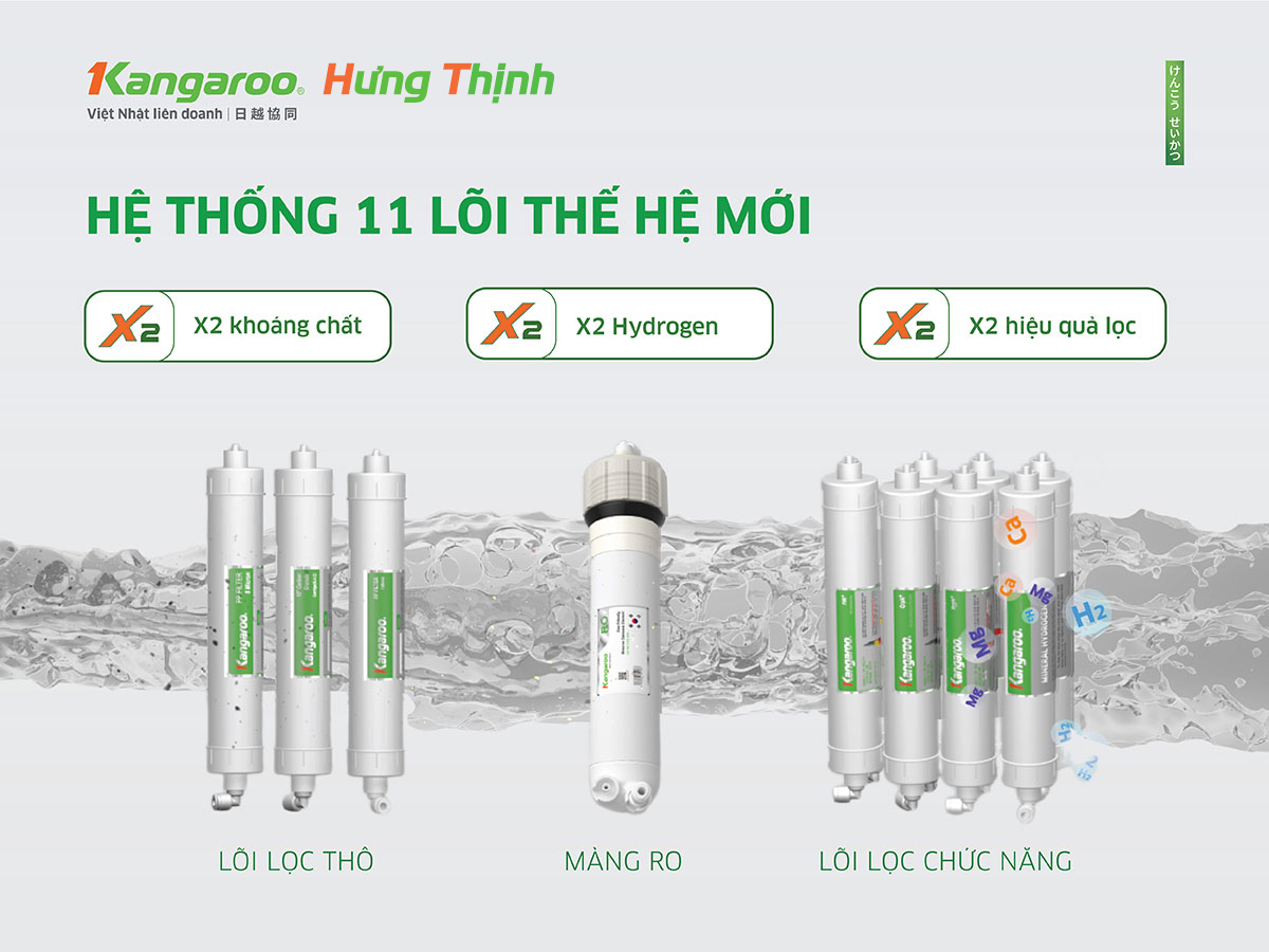 Máy lọc nước Hydrogen Kangaroo KG11A18 thế hệ mới 2024 được trang bị hệ lõi siêu lọc 11 lõi vượt trội, gấp đôi Hydrogen và khoáng chất cho cơ thể. Màng lọc RO Vortex giúp giảm 75% nước thải, tuổi thọ kéo dài tới 3 năm.