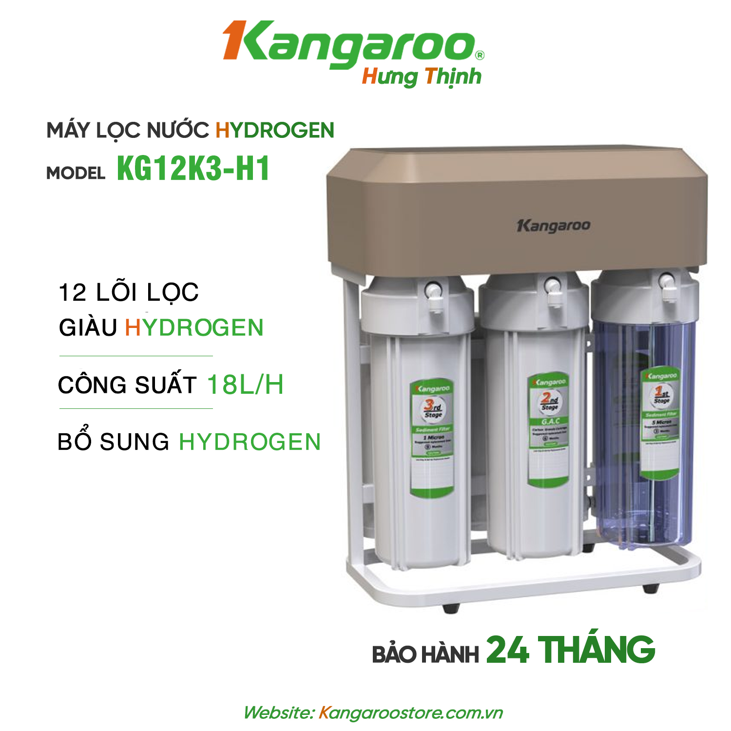 Duy nhất Kangaroo có bằng sáng chế độc quyền thiết bị lọc nước Hydrogen. Nước Hydrogen bổ sung vi khoáng tự nhiên và chất điện giải có lợi, giúp tăng cường miễn dịch và nước có vị ngon tự nhiên. Đồng thời hoạt động như một chất chống oxy giúp loại bỏ gốc tự do có hại gây lão hóa, các bệnh dạ dày…