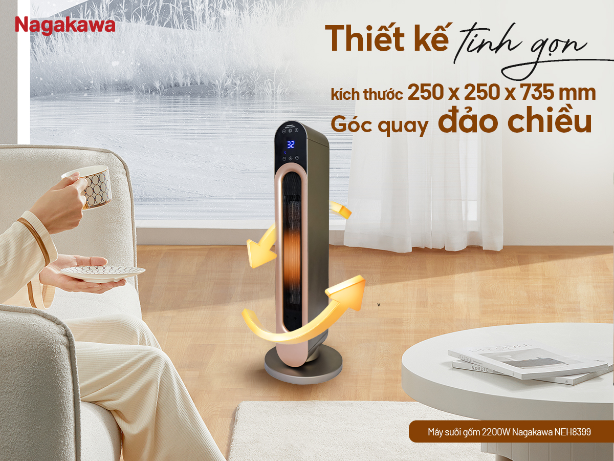 Không chỉ là một thiết bị sưởi ấm, Máy sưởi gốm 2200W Nagakawa NEH8399 còn được xem như một điểm nhấn nội thất trong căn nhà hiện đại. Với kích thước 250 x 250 x 735 mm, sản phẩm giữ được dáng đứng thanh thoát, gọn gàng, dễ dàng đặt ở phòng khách, phòng ngủ hay bất kỳ không gian nào mà không chiếm nhiều diện tích.