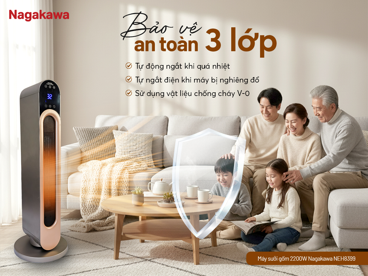 Trong những ngày đông giá rét, sự an tâm quan trọng không kém sự ấm áp. Máy sưởi gốm 2200W Nagakawa NEH8399 được trang bị hệ thống bảo vệ 3 lớp thông minh: tự động ngắt khi quá nhiệt, tự ngắt điện khi máy nghiêng đổ và vỏ ngoài làm từ vật liệu chống cháy chuẩn V-0.